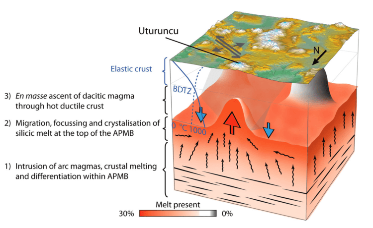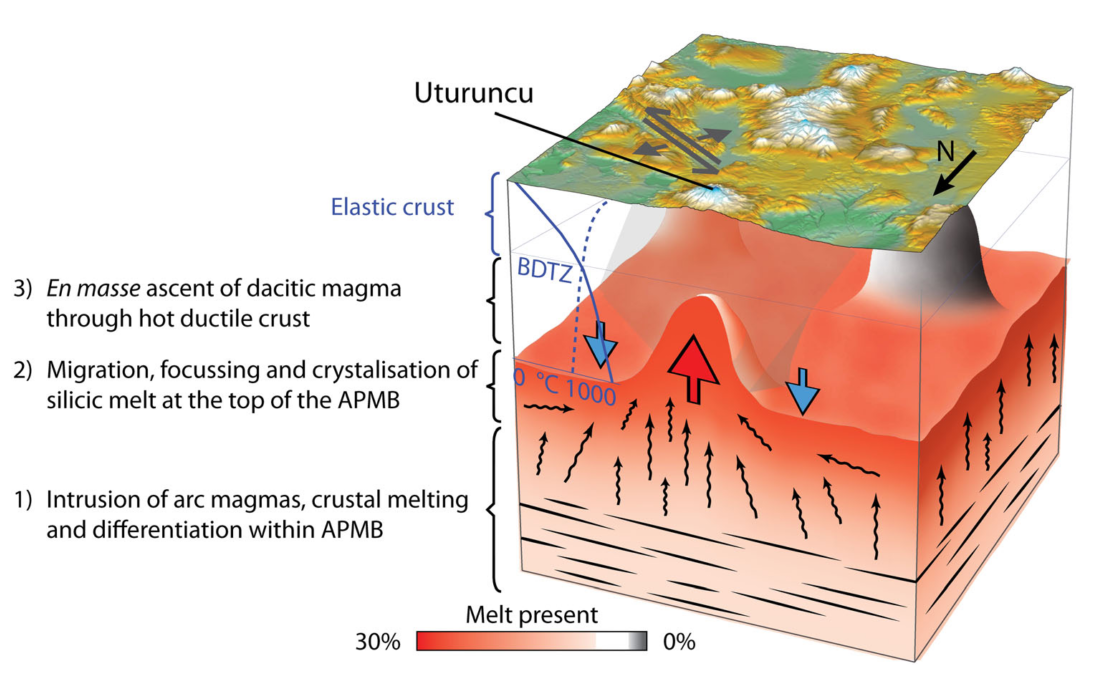 This study focused on the driving mechanism behind a 70 km wide region of ground uplift centred on Uturuncu volcano, in the Altiplano-Puna region of southern Bolivia. It was carried out as a joint part of the PLUTONS project. I conducted a series of forward models using finite element analysis to test for first-order parameters to constrain a viable model for the observed maximum line of sight uplift rate of 1–2 cm/yr between 1992 and 2006. The preferred model suggests that pressurisation of a magma source extending upward from the Altiplano-Puna magma body (like a magmatic diapir) caused the observed surface uplift.